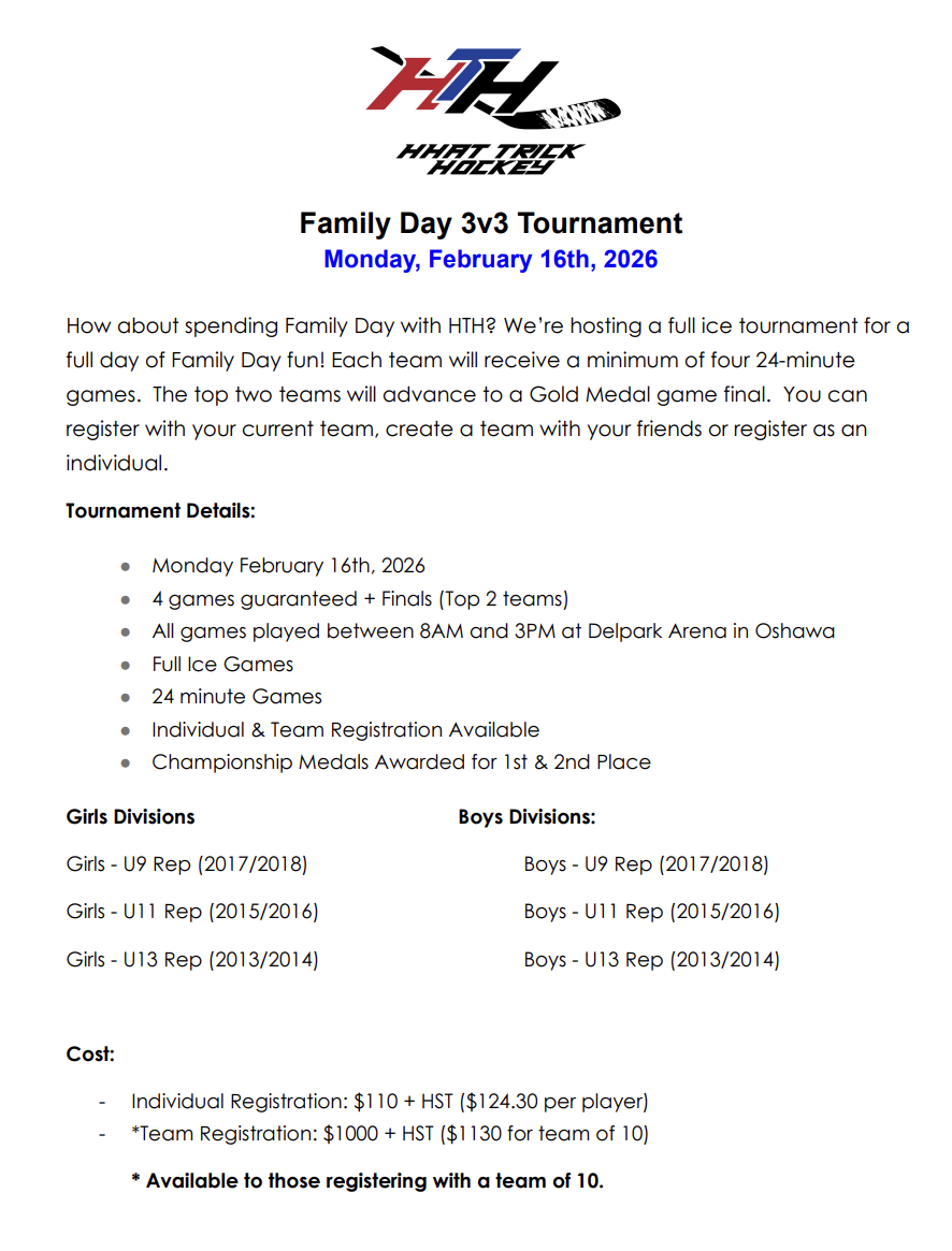HHAT TRICK HOCKEY 3 on 3 teams consists of 9 skaters and 1 goalie. Team, group and individual online registrations are accepted. Rep, DS and House League divisions available. Full ice games for all age groups! Our 9 game season will run in the Spring of 2026 with games played on Saturdays OR Sundays in Oshawa and Courtice.